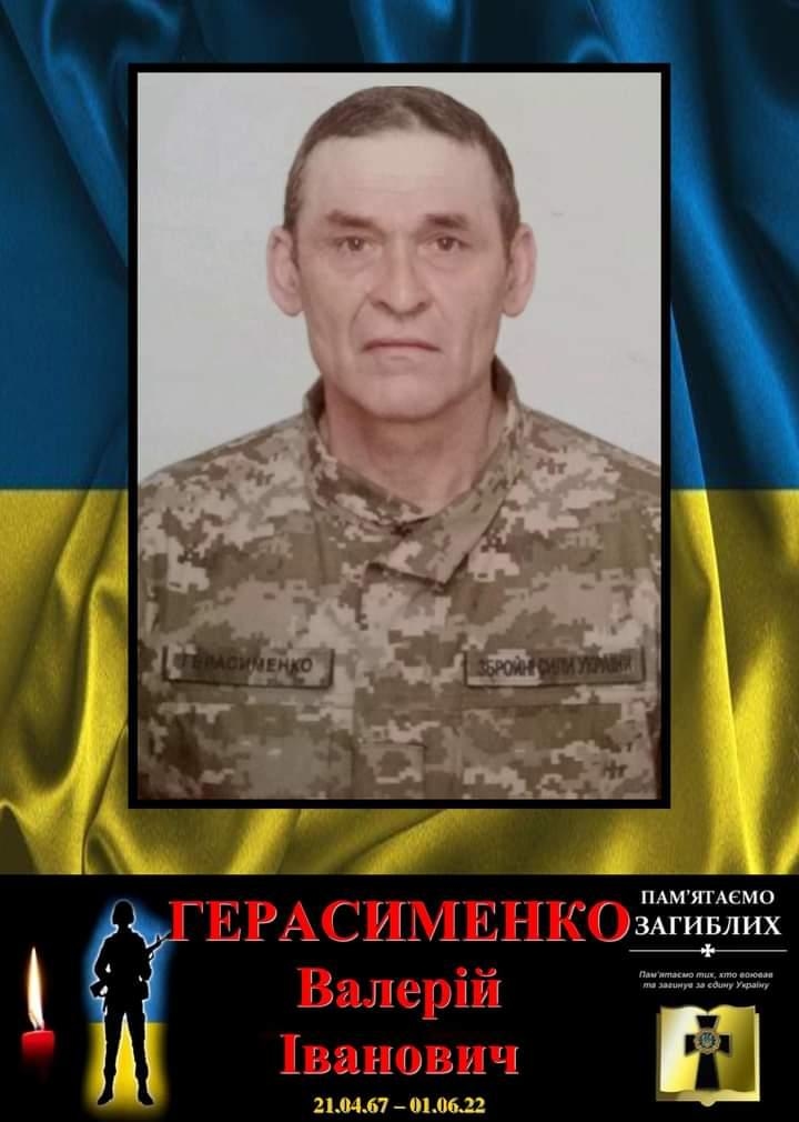 - Солдат Валерій Герасименко загинув 1 червня 2022 р. біля с-ща Зайцеве Бахмутського району Донеччини. Під час виконання бойового завдання зазнав смертельних мінно-вибухових травм. Захиснику було 55 років. Валерій народився в с. Андріївка Чернігівської області. Навчався в Андріївській та Дорогинській середніх школах. У 1989 р. закінчив Чернігівське середнє професійно-технічне училище № 9 та здобув спеціальність годинникаря. У 2015–2016 рр. у складі 30-ї окремої мотопіхотної бригади імені князя Костянтина Острозького брав участь в АТО. У 2021 р. повернувся на службу за контрактом до рідної бригади. Продовжував виконувати бойові завдання на території проведення ООС. Повномасштабну війну Валерій зустрів на передовій разом із побратимами з 30-ї ОМБр. Чоловік обіймав посаду стрільця-помічника гранатометника та успішно нищив ворога, щиро прагнучи перемоги над російськими окупантами та звільнення українських земель. «Нехай добрий, світлий спомин про покійного захисника назавжди залишиться у пам'яті усіх, хто знав його, любив та шанував. Нехай душа загиблого знайде вічний спокій. Вічна пам'ять Герою! Слава Україні!», — написала донька загиблого Олена. Поховали Валерія у рідному селі. Вдома на нього чекала донька та інші рідні. Посмертно воїна нагородили орденом «За мужність» ІІІ ступеня.Платформа пам'яті 'Меморіал'