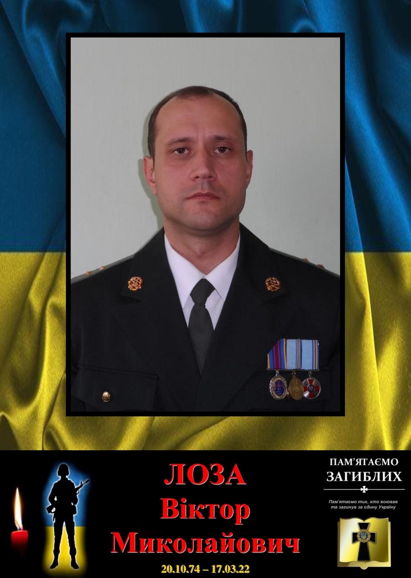 - Старший лейтенант Віктор Лоза помер 17 березня 2022 р. від тяжких поранень, які отримав у лютому під час оборони рідного Чернігова від російських окупантів. Чоловік народився і все життя прожив у м. Чернігів. Навчався у місцевій школі № 11. У 2000 р. закінчив школу прапорщиків. Працював у службі пожежної безпеки та військкоматі. У вільний час любив відпочивати з друзями на природі та займатися риболовлею. З 2013 р. Віктор обіймав посаду командира БМП 1-ї окремої танкової Сіверської бригади. З 2014 р. брав участь в АТО на Донбасі. У 2016 р. закінчив Житомирський військовий інститут імені С. П. Корольова за спеціальністю «Інформаційні технології» та здобув первинне офіцерське звання. Під час повномасштабного російського вторгнення Віктор командував мінометною батареєю у рідній 1-й танковій бригаді. З перших днів обороняв Чернігівщину. «Мій батько був доброю, чуйною, надійною людиною не тільки для своїх друзів, рідних і близьких, а й для країни. Він, не вагаючись, з 2014 р. став на захист України», — зазначила донька загиблого Вікторія. «Спочивай з миром, мав честь служити з тобою», — написав побратим Олександр. Офіцера поховали на кладовищі в Ялівщині у Чернігівській області. У Віктора залишилися мама і донька. Старший лейтенант Віктор Лоза посмертно нагороджений орденом Богдана Хмельницького ІІІ ступеня.Платформа пам'яті 'Меморіал'